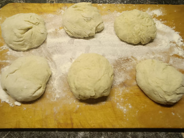 Подошедшее тесто снова обомните. Тесто разделите на 10-12 одинаковых кусочков и скатайте из них шарики.