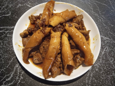 Заменила говядину на гуся. Сначала отварила мясо гуся, добавив приправу в бульон. Бульон получился очень ароматный, наваристый со "звёздочками", а мясо - мягкое и жирное в меру, вся "изюминка" блюда.
