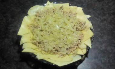 Выложите лапшу на блюдо для подачи. Уложите на нее лук. Немного лука оставьте для украшения.