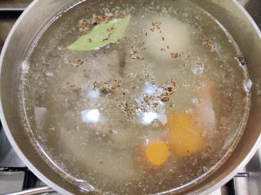 Морковь вымойте и очистите, разрежьте на несколько кусочков. Луковицу очистите. Добавьте овощи в кастрюлю. Туда же отправьте лавровый лист, семена укропа и перец горошком. Посолите бульон. Варите мясо на медленном огне в течение примерно 1,5-2 часов, до мягкости. Мясо должно легко разделяться на волокна при лёгком нажиме лопатки. Время варки мяса зависит от того, какого возраста было животное, от какой части туши кусок и от его величины.