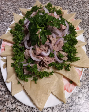 Никогда не готовила бешбармак из говядины. Решила попробовать, взяла за основу этот рецепт. Делала из свинины, только не варила, а тушила с жареным луком на сковороде в воде минут 30 до мягкости. Сделала тесто по описанию в рецепте, получилось достаточно тугое. Тесто раскатала и порезала на квадратики. А чтоб ещё вкуснее было, на каждый квадратик теста положила укроп и чеснок, завернула рулетиками и потушила в сковороде с тушеным мясом. Получилось очень ароматно и оригинально. Мой а-ля бешбармак улетел с тарелки. Тесто очень вкусное получилось, а с чесноком и зеленью вообще супер. Мясо мягкое и сочное. Всё вместе прекрасно сочетается. Блюдо сытное, ароматное и вкусное. В следующий раз попробую сделать бешбармак из говядины. Спасибо автору за идею!