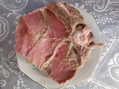 Мясо обмойте и разрежьте на средние куски. Залейте их холодной чистой водой так, чтобы она покрыла их полностью. Какая часть свинины подходит для бешбармака? Выбирайте ту часть тушки, в которой много мяса и немного жировой прослойки.