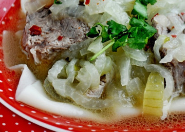 Готовое мясо выньте из бульона. Отправьте в кастрюлю с бульоном сочни (так еще называют лапшу для бешбармака). Варите их по инструкции на упаковке. Свинину же немного остудите и нарежьте на тонкие кусочки.