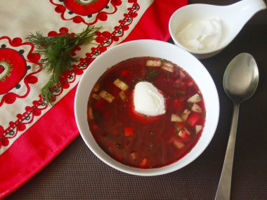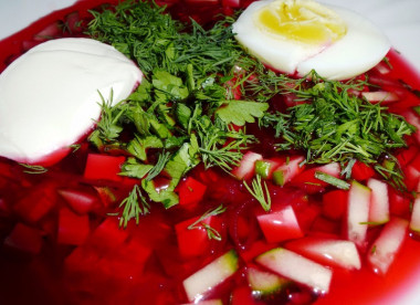 Перед подачей положите в тарелку основу и залейте ее холодным свекольным отваром вместе со свеклой. Добавьте сметану по вкусу.