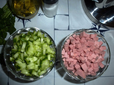 Колбасу очистите от оболочки и нарежьте, снова на кубики. Нарезанные на одинаковые кусочки блюда выглядят эстетичнее.