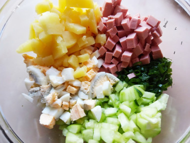 Картофель отварите в мундире. Как отварить картошку в мундире? Хорошо помойте клубни, залейте холодной водой в кастрюле и поставьте вариться на небольшой огонь. После закипания варите картофель 20-25 минут, в зависимости от размера и сорта. Готовность проверьте острым ножом — он легко проткнет клубень. Отваренный картофель полностью остудите, очистите от кожуры и нарежьте небольшими кубиками.