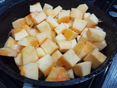 В сковороде на среднем огне разогрейте растительное масло. Выложите тыкву и обжарьте, помешивая, 3 минуты. Тыква при этом должна сохранить форму, но стать немного мягче. Переложите тыкву в миску.