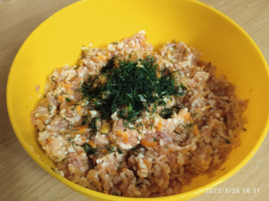 Лук почистите, мелко нарежьте и также добавьте в фарш. Если вы не очень любите вареный лук, то прежде чем добавить лук в фарш, можно его немного обжарить на сковороде с добавлением капли растительного масла и только потом добавить в фарш.