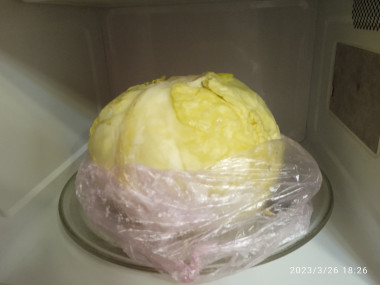 Никогда не готовила голубцы в микроволновке, но рецепт заинтересовал. Очень понравился способ подготовки капусты. Кочан у меня был большой. Сначала поставила его в микроволновку на 10 минут, потом еще на 10. После этого кочерыжка легко вырезалась, а листья отошли от кочана. Только надо осторожно снимать пакет из-за горячего пара.