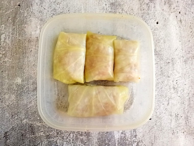 Подготовьте форму, которую можно использовать в микроволновке. Напомню, что категорически не подходят все виды металлической кухонной утвари, также посуда с блестящим рисунком. Можно использовать в микроволновках все виды стекла, фарфора, керамики, и даже бумажная посуда. Выложите в глубокую емкость голубцы, добавьте 100 мл воды и накройте пищевой пленкой или же накройте непосредственно в микроволновке специальной крышкой для СВЧ.
