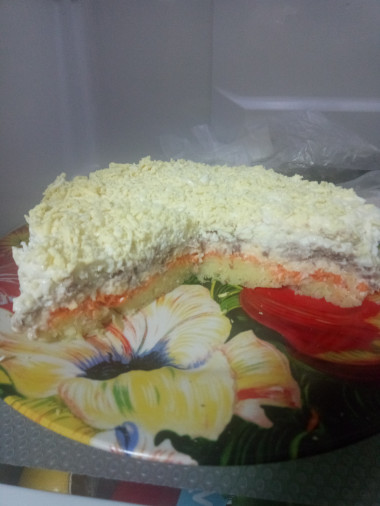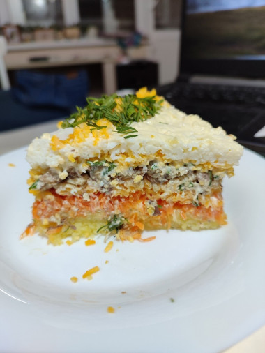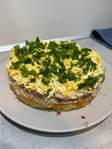 Обожаю этот салатик, только делаю его немножечко по-другому: нижним слоем кладу тертую на мелкой терке отваренную морковь, а мелконарезанный лук предварительно мариную в уксусе. Всем приятного аппетита!