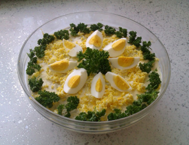 Обожаю слоеные салатики! Мимозу готовлю часто, хоть сейчас и много новых салатов, но классика, проверенная годами, всегда в приоритете) Мне очень нравится сочетание продуктов и внешний вид. Слои я сделала также, как и в этом рецепте. Ингредиенты я выкладывала в салатник слоями. Украсила крошкой из желтка и четвертинками вареных яиц. Вместо укропа взяла кудрявую петрушку, она тоже выглядит нарядно. Салат нежный и сытный, приятной консистенции. Да и воспоминания о детстве радуют) Мария, спасибо за рецепт!