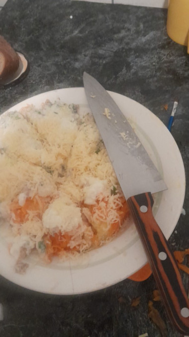 На морковь уложите слой сыра. Сделайте сверху сеточку из майонеза.