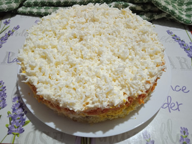 Последним слоем выложите тертые белки. Смажьте этот слой майонезом и хорошенько разровняйте, так как это последний слой.