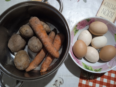Морковь и картофель вымойте со щеткой, не очищая от кожуры. Выложите овощи в кипящую воду и отварите до готовности. Затем охладите и очистите.