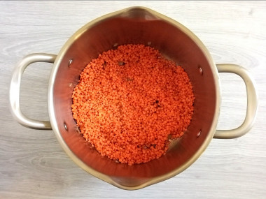 Красную чечевицу хорошо помойте холодной водой. Добавьте чечевицу в кастрюлю к овощам.