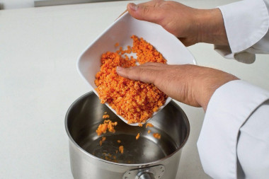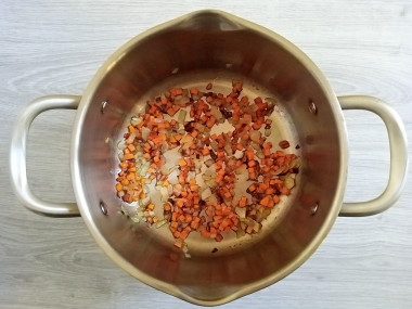 Выложите в кастрюлю подготовленные морковь и чеснок, перемешайте. Обжарьте овощи примерно 3-4 минуты.