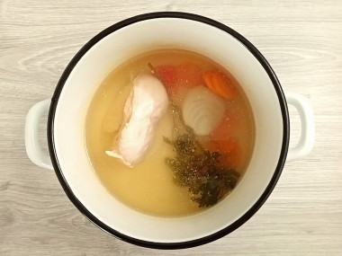 Для большей сытности я решила варить суп на курином бульоне. Для этого взяла грудку и добавила в бульон луковицу, морковь, веточку петрушки и кусочек сладкого перца.