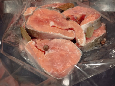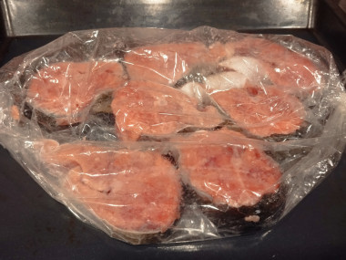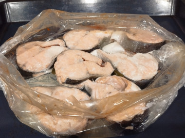 Красную рыбу любим разную и в любом исполнении. В этот раз приготовила на ужин горбушу в рукаве в духовке. Только немного изменила: по рецепту автор запекала рыбу целиком,а я предварительно порезала на стейки.