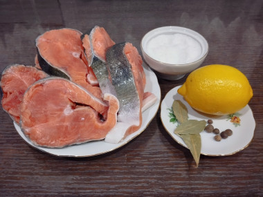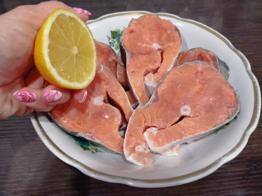 Выложила стейки в глубокую чашку, полила соком лимона. Оставила минут на 25.