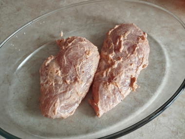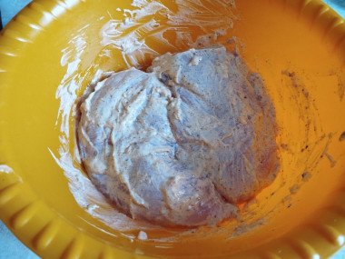 Обмажьте получившимся майонезным соусом куриные грудки со всех сторон и оставьте мариноваться на 1 час при комнатной температуре. Если планируете мариновать мясо дольше, поставьте его в холодильник.