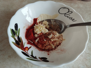 Из специй я взяла паприку копчёную, соль,перец черный,смесь перца и лайма. Специи и измельчённый чеснок добавила в майонез и перемешала. Обмазала грудки по всех сторон полученной смесью и оставила мариноваться на один час при комнатной температуре.