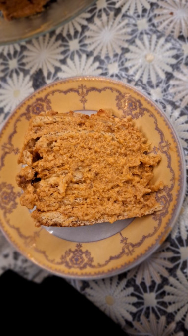 Коржи получились красивые, с приятным легким медовым ароматом. Края у них немного загнулись после остывания, но я полагаю, что это из-за того, что я их складывала на тарелку, и они приняли ее форму. Коржи тонкие и мягкие, но при этом они хорошо крошатся (один корж я раскрошила для украшения торта). Коржи я промазала сливками и вареньем. Пропитавшись, они хорошо скрепились, так что кусочки нарезанного торта хорошо держали форму и не расползались.