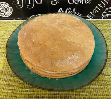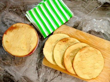 Готовые коржи переложите на ровную поверхность. Обрезки теста соедините и раскатайте еще один корж. Его можно использовать для торта или подрумянить получше и измельчить в крошку. Крошку можно применить для отделки торта.
