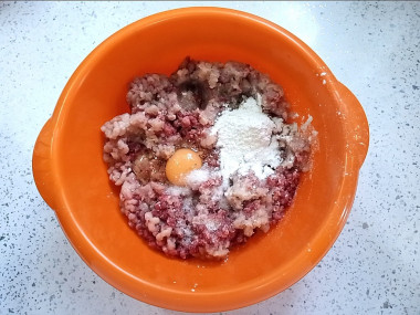 Для изготовления самого фарша взяла говядину и куриную грудку. Мне кажется, они хорошо гармонируют. Пропустила мясо через мясорубку вместе с луком. Добавила яйцо, соль, паприку и крахмал (у меня был кукурузный). Готовый фарш хорошо отбила о дно миски, это делает его плотнее.