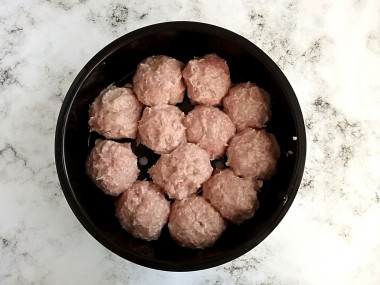 Охлаждённый фарш выньте из холодильника и мокрыми руками слепите из него котлеты. Котлеты можете слепить из всего фарша, часть приготовить сразу, а часть заморозить. Чашу для варки на пару смажьте растительным маслом (чтобы котлеты было легче снимать), выложите на неё подготовленные котлеты.