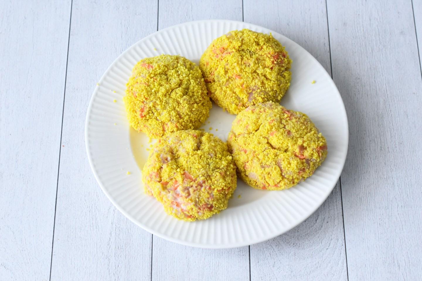 Влажными руками сформуйте из фарша котлеты среднего размера и обваляйте со всех сторон в панировочных сухарях. Если у вас нет панировочных сухарей, можете сделать их самостоятельно: нарезать кубиками несколько ломтиков батона и подсушить в духовке до золотистого цвета. Затем сложите сухарики в пакет и пройдитесь по ним скалкой или измельчите в блендере. В обычные сухари самостоятельно добавьте для цвета паприку, куркуму, соль и перец по вкусу.
