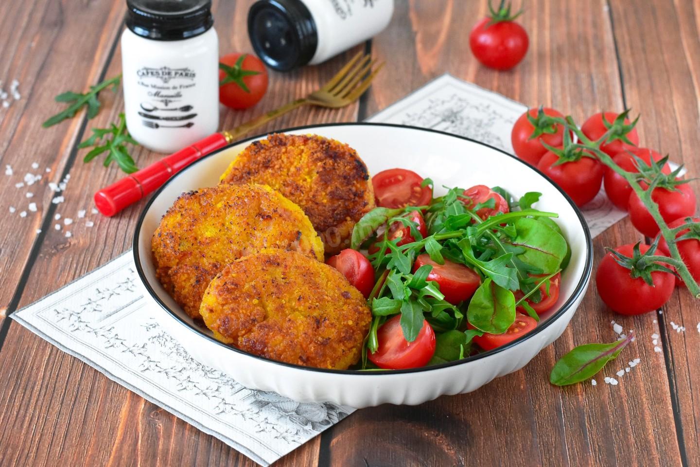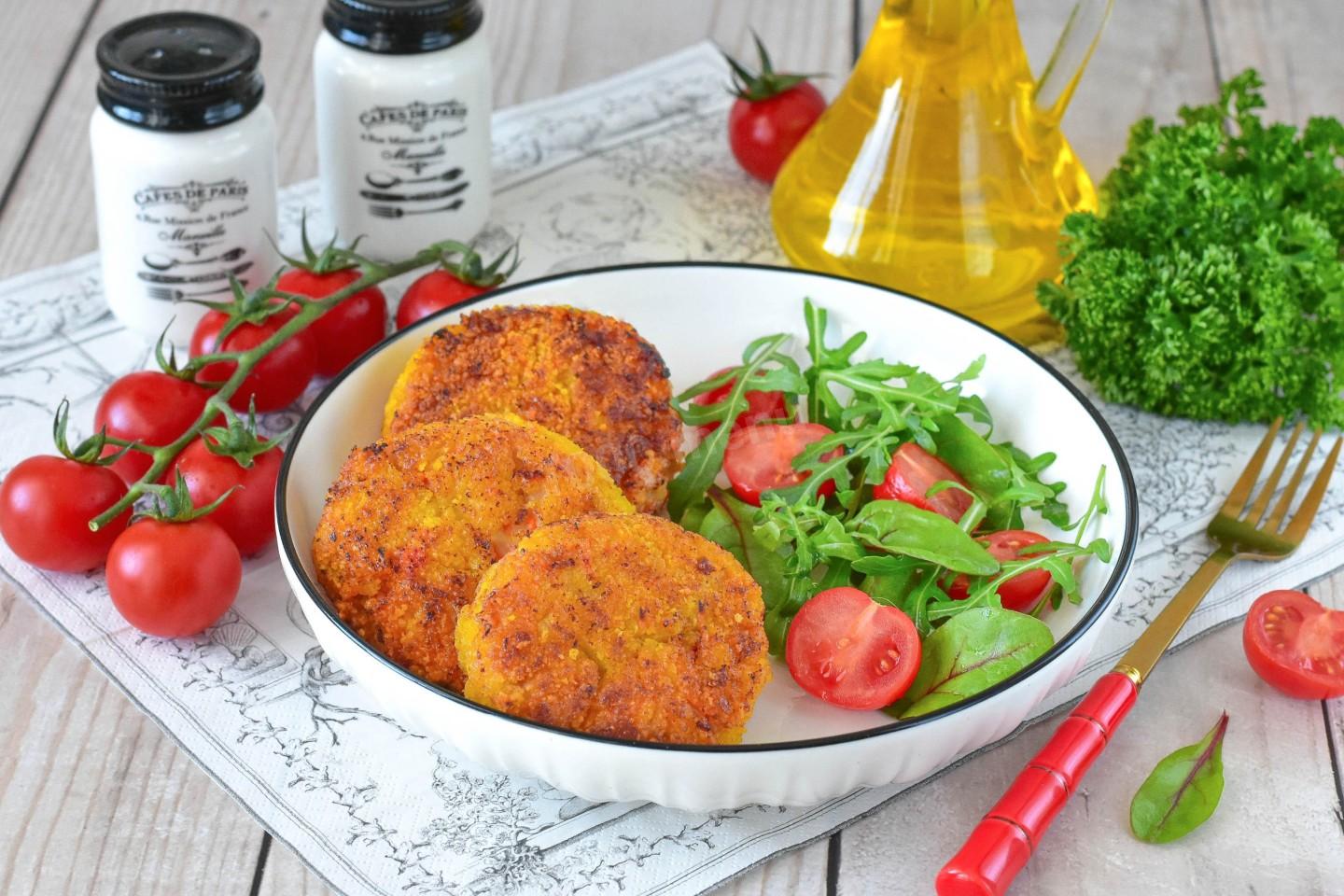 Постные котлеты из кальмаров переложите на тарелку и подайте к столу с салатом из свежих овощей и зелени, а также с любым гарниром по вкусу. Приятного аппетита!