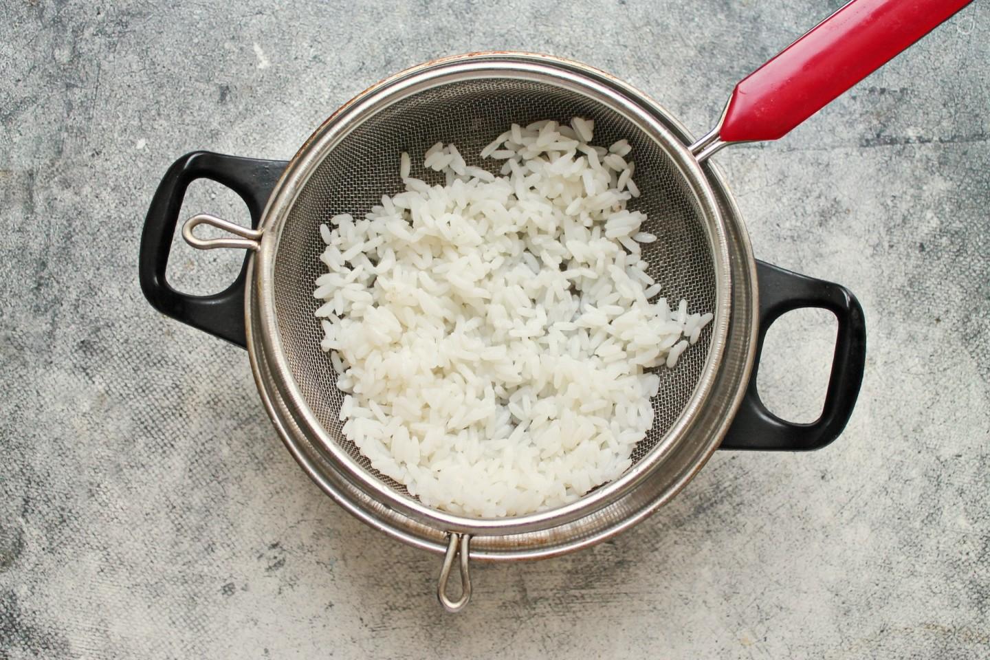 В кастрюлю налейте 500 миллилитров воды, посолите и доведите до кипения. Рис вымойте и положите в кастрюлю, варите до полной готовности. Откиньте рис на сито и дайте отвару полностью стечь. О выборе и тонкостях приготовления риса можно прочитать под рецептом ниже.