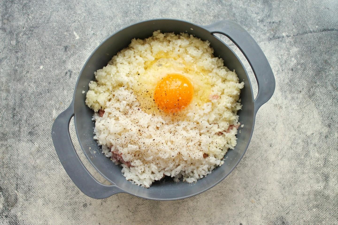 Мясной фарш (у меня свинина-говядина) положите в миску и добавьте отварной рис. Капусту и репчатый лук порежьте кусками, положите в блендер и измельчите в мелкую крошку, добавьте к фаршу. Вбейте в миску яйцо, посолите и поперчите. Хорошо перемешайте и отбейте фарш. Для этого соберите массу в руку, поднимите над чашей и бросьте обратно. Сделайте так 10-15 раз, пока он не станет плотный.