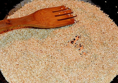 Сковороду прогрейте на среднем огне. Высыпьте семена кунжута и обжарьте, постоянно помешивая 5-7 минут до появления яркого орехового аромата и легкого золотистого цвета. Важно проследить, чтобы кунжут не пригорел, иначе паста будет горчить. Не отходите от плиты ни на шаг. Я обжаривала кунжут частями, так за ним легче уследить. Пересыпьте кунжут в мисочку и охладите. Как выбрать сковороду читайте в статье на эту тему. Ссылка в конце рецепта.