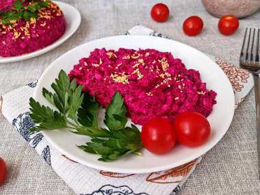 Как сделать салат Розовый фламинго с крабовыми палочками? Подготовьте продукты. Свеклу предварительно отварите или запеките, как это сделать, смотрите по ссылкам в конце рецепта. Яйца также отварите и остудите. Вместо крабовых палочек можете взять крабовое мясо. Сыр берите твердый или полутвердый, вкусный и качественный.