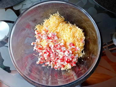 Сыр натрите на мелкой терке. Именно на мелкой, не на крупной. От этого будет зависеть нежность салата.