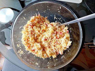Салат Розовый фламинго с крабовыми палочками — получается просто нежнейшим.