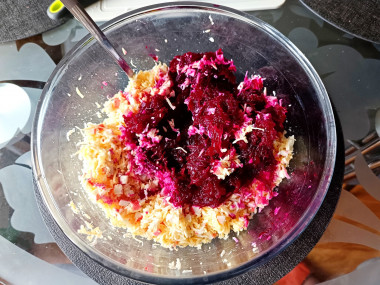 Свеклу очистите и натрите на той же терке, что и все другие ингредиенты.