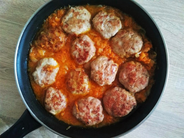 Выложите к овощам обжаренные котлеты. Можно овощи и котлеты обжаривать параллельно на двух сковородах, тогда процесс приготовления пройдет немного быстрее.