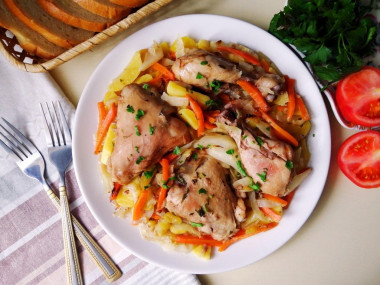 Блюдо получилось очень сочное, так как при тушении выделилось много вкусного сока. Овощи стали мягкие, нежные, мясо хорошо разварилось, легко отделялось от кости.  Очень вкусно!