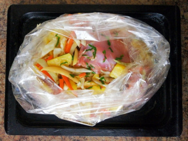 Возьмите рукав для запекания и сложите в него маринованную курицу, подготовленные овощи. Завяжите край рукава или закрепите клипсами, выложите на противень. Сделайте в рукаве несколько отверстий зубочисткой для выхода пара. Поставьте его в предварительно разогретую духовку на 40-60 минут. Время будет зависеть от мощности духовки и от размера курицы и порезанных овощей. Чем крупнее курица и нарезка овощей, тем больше времени нужно для их приготовления.