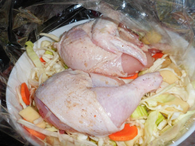 Прежде чем выкладывать курицу в рукав, замариновала ее, дала настояться 30 минут.