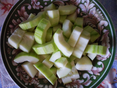 Кабачки помойте и очистите от шкурки. Если кабачки молодые, то очищать от шкурки не нужно. Порежьте кабачки большими кубиками и добавьте к картошке и перемешайте.