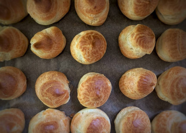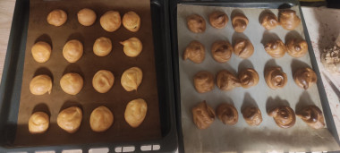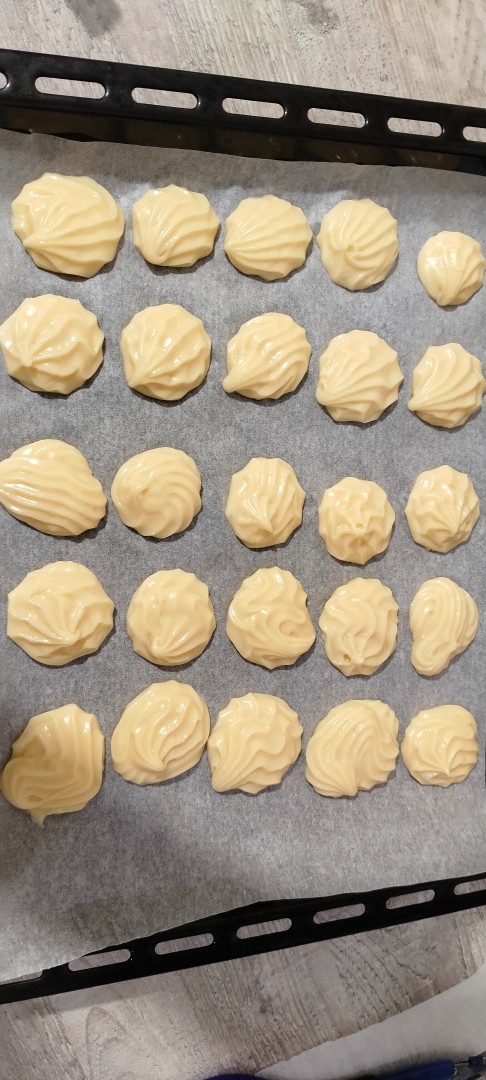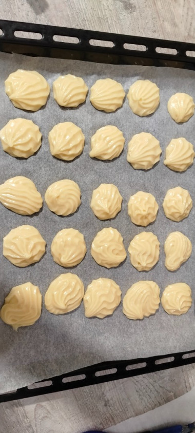 Отсадите на противень, застеленный пергаментом, небольшие звездочки на расстоянии 4-5 см друг от друга. Выпекайте профитроли в разогретой до 200°С духовке 10 минут и еще 20-25 минут при 180°С. Точное время выпекания определяйте по своей духовке. Духовку во время выпекания не открывайте, иначе изделия опадут.