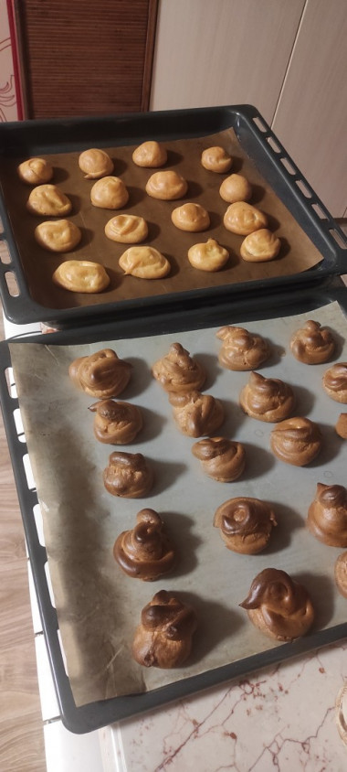 Делал строго по рецепту. Первый раз. Пропеклись идеально. 10 минут - 220 и 25 минут - 180. И до полного остывания в слегка приоткрытой духовке. Крем... Ну а вот крем не зашёл. Видимо просто потому что оказывается не люблю заварной) Остальным безумно понравился. В целом рецептом и особенно результатом доволен как слон. Надо только поиграться с кремами. Предпочитаю более молочно сливочный.
