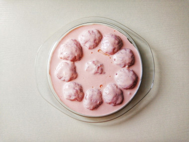 Смешайте сметану, майонез и кетчуп, если получается слишком густо, то добавьте воду или бульон. Полученным соусом залейте ежики, чтобы они покрылись на 2/3 поверхности.