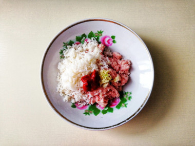 Фарш у меня был свиной домашний. Приготовила его, измельчив мясо вместе с луком в блендере. Добавила к мясу отваренный рис, чайную ложку томатной пасты, натертую дольку чеснока, соль. Яйцо в фарш я не добавляла, так как рис делает фарш достаточно вязким, в следствии чего ёжики хорошо держат форму и не разваливаются.