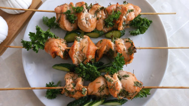 Я в восторге от куриных шашлычков по данному рецепту! Замариновала куриное филе, майонез заменила на кефир, добавила специи, немного зелени и оставила на несколько часов. Перед приготовлением, шпажки замочила в воде. В форму для запекания, как указано, добавила воду и решила ещё добавить сок лимона для аромата. За счёт воды в форме, куриные шашлыки не подгорели и стали сочными, не смотря на то, что куриная грудка славится своей сухостью. Взяла на заметку, этот секрет с водой.