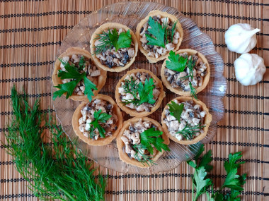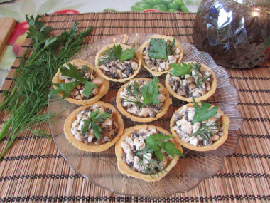 Начините тарталетки. На донышко положите 1 ч.л. сырную начинку и ровно распределите. Сверху добавьте 1 ст.л. курино-грибную начинку и также разровняйте, чтобы было удобно положить украшение. Для украшения можно обжарить пластинки шампиньонов или взять мелкие маринованные шампиньоны или опята. По вкусу каждый вариант будет хорошим. Завершите композицию листиком зелени или веточкой укропа.